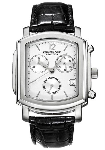 Kenneth Cole adds chronographic timekeeping to this classically designed stainless steel watch. The left subdial measures minutes elapsed on the chronograph (up to 30 minutes), while the right subdial displays time seconds. The bottom subdial shows days of the week. The chronograph has two push controls on either side of the winder.In addition to being functional, it's also a stylish watch that has a bold look and feel. A brushed stainless steel bezel is set atop a polished backing with a rounded top and bottom and ridged sides. It measures approximately 1.6 inches wide. The black crocodile-style leather band is cracked but smooth, and has a very soft tan-colored interior.